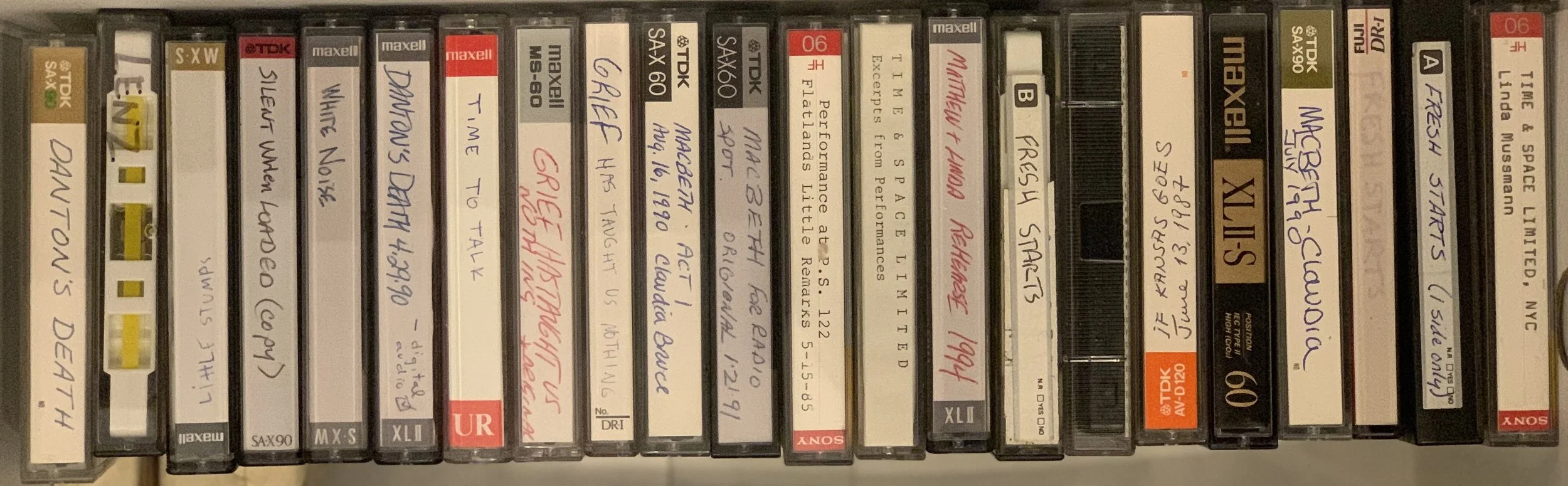 In 1989, Klaus Schöning of WDR Radio Cologne in Germany commissioned Linda Mussmann to adapt her original version of the Georg Büchner play Danton’s Death for a one hour broadcast. Thus began a period of experimentation in audio for TSL. Other Mussmann/Bruce productions from this era that have radio play versions include Lenz (1993, WDR), and Little Stumps and Real Conversations (1989, Independent). After several successful stage-to-radio adaptations, Mussmann flipped the script and authored two pieces which were intended for primarily for the airwaves and secondarily for the stage: Grief Has Taught Us Nothing (SFB, 1992) and James B. Snead (SFB, 1997).