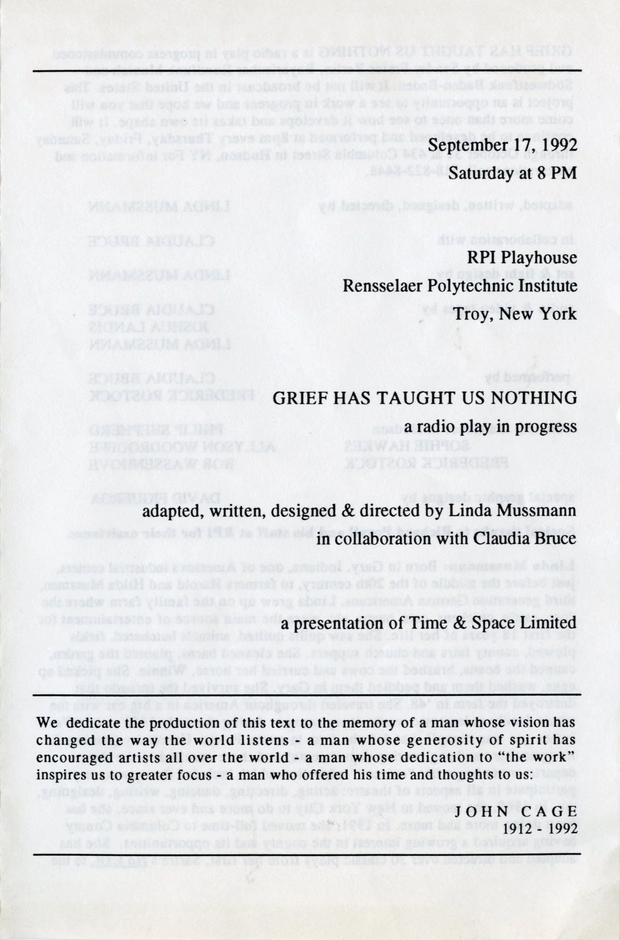 In 1991, while performing M.A.C.B.E.T.H. in Poland, Linda Mussmann and Claudia Bruce met Renata Jurzik of Sender Freies Berlin Radio (SFB). Jurzik commissioned the duo to produce an original radio play which became Grief Has Taught Us Nothing. What makes this unique amongst the TSL radio plays is that it was first produced for radio, and later adapted for the stage.